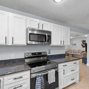 Kitchen with new granite counters, Subway tile backsplash, stainless steel appliances