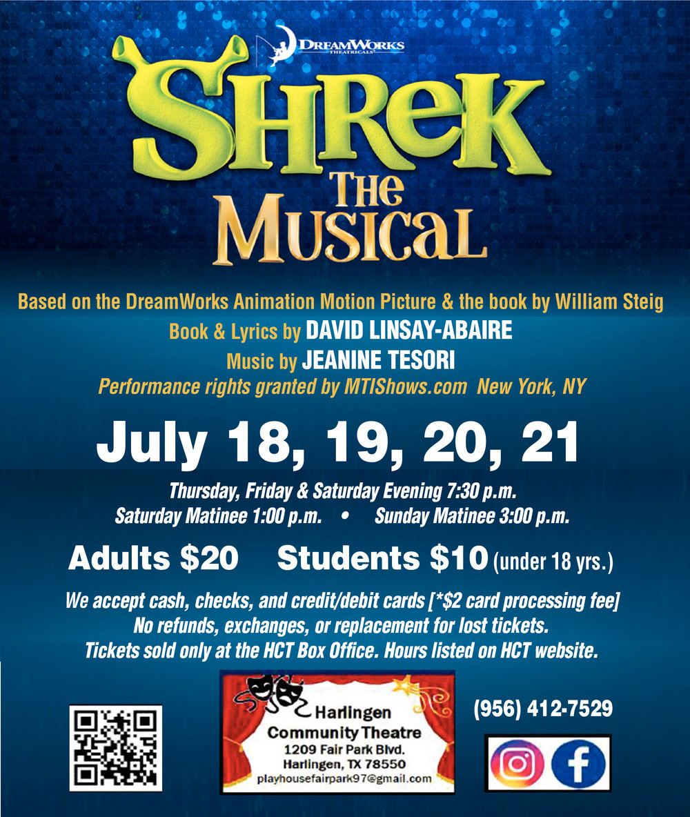 We have four tickets to Shrek, The Musical showing at the Harlingen Community Theatre located at FairPark Avenue. Picture of the tickets can be found here.